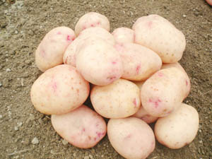 Клубни вырастают продолговатой формы, кожура тонкая, гладкая, светло-коричневого цвета. Плоды имеют довольно большие размеры, а массой достигают от 90 до 130 г. В среднем один куст может образовывать до 10 – 15 таких немаленьких клубней. Мякоть окрашена в мягкий кремовый цвет и имеет превосходные вкусовые качества, а содержание крахмала колеблется между 13 и 17%. Глазков, как правило, образуется немного, да и они очень мелкие. Товарность клубней (83 – 93%), а лежкость держится на 94%.